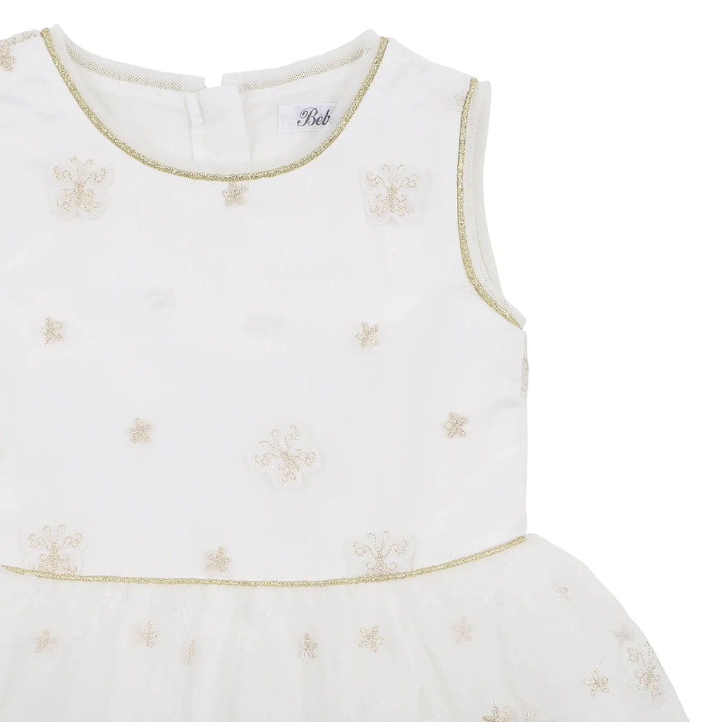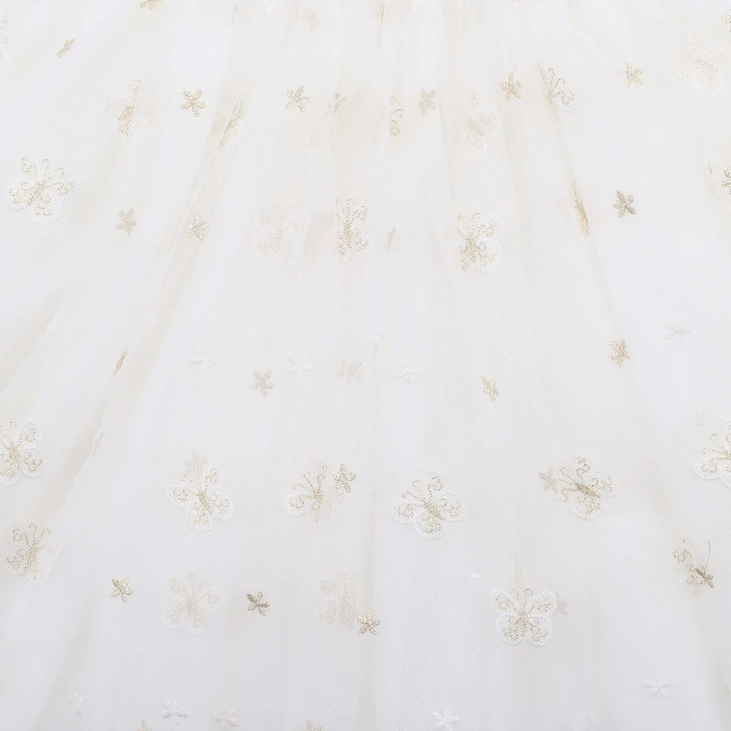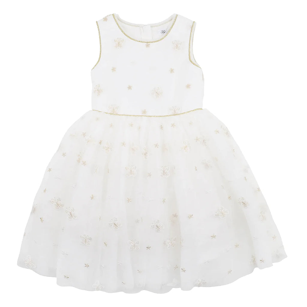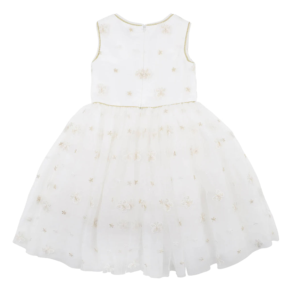 Perfect for special occasions, this beautiful fully lined sleeveless dress in an embroidered butterfly tulle features a gathered full skirt, finished with gold cord piping around the waist, neck and armholes and a back zip for ease of dressing.