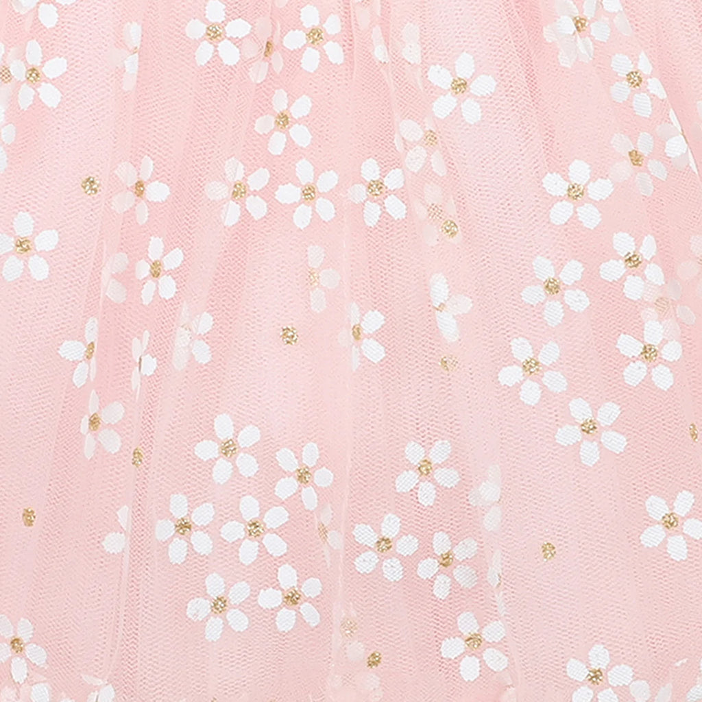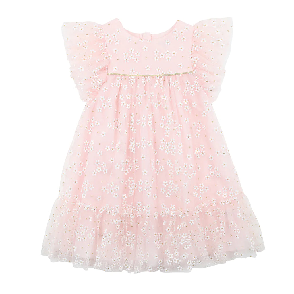 This pretty pink tulle daisy glitter print dress, features lurex piping at yoke seam, gathered skirt with hem frill, gathered frilled sleeves and a zip back opening for easy dressing.