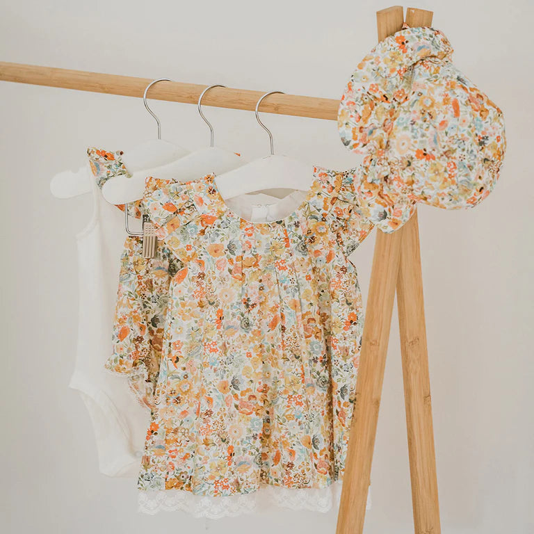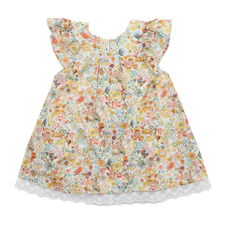This gorgeous Liberty of London Classic Meadow print dress features frilled sleeves, front neck pleats, lace trim on the hem, and a back zip for ease of dressing. Garment photographed in size 00 (3-6mth). Australian owned and designed.