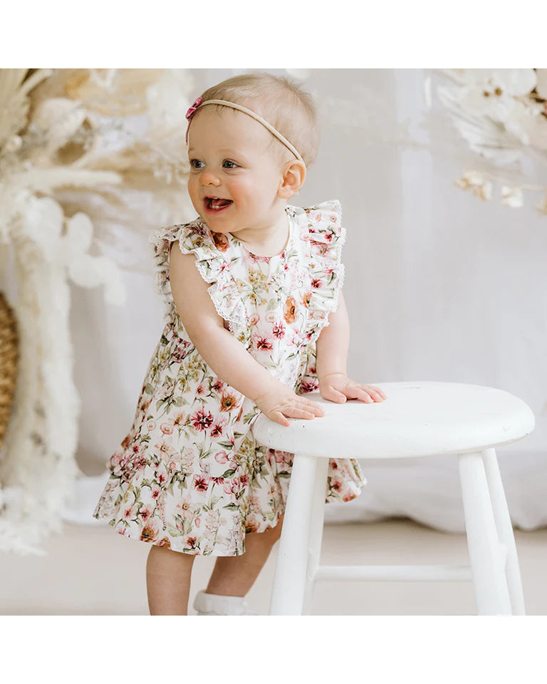 This gorgeous Liberty of London Fairy tale print dress features over the shoulder frills with lace trim, gathered skirt with frill and a back neck placket opening. Garment photographed in size 00 (3-6mth). Australian owned and designed.