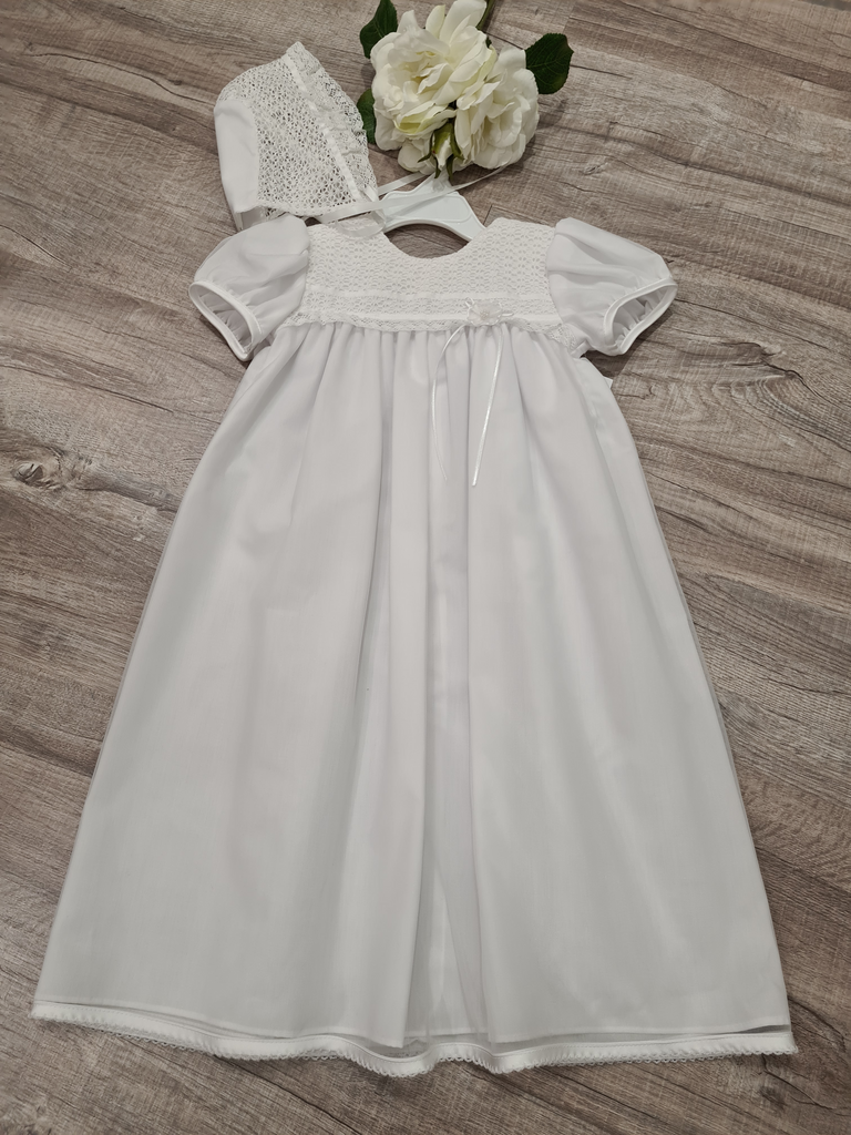 Beautiful girls 100% cotton broadcloth gown with tricot overlay. The gown measures 25 inches in length; includes matching all lace bonnet. Features include classy full lace paneled bodice and ribbon/lace accents. Handmade and hand wash.