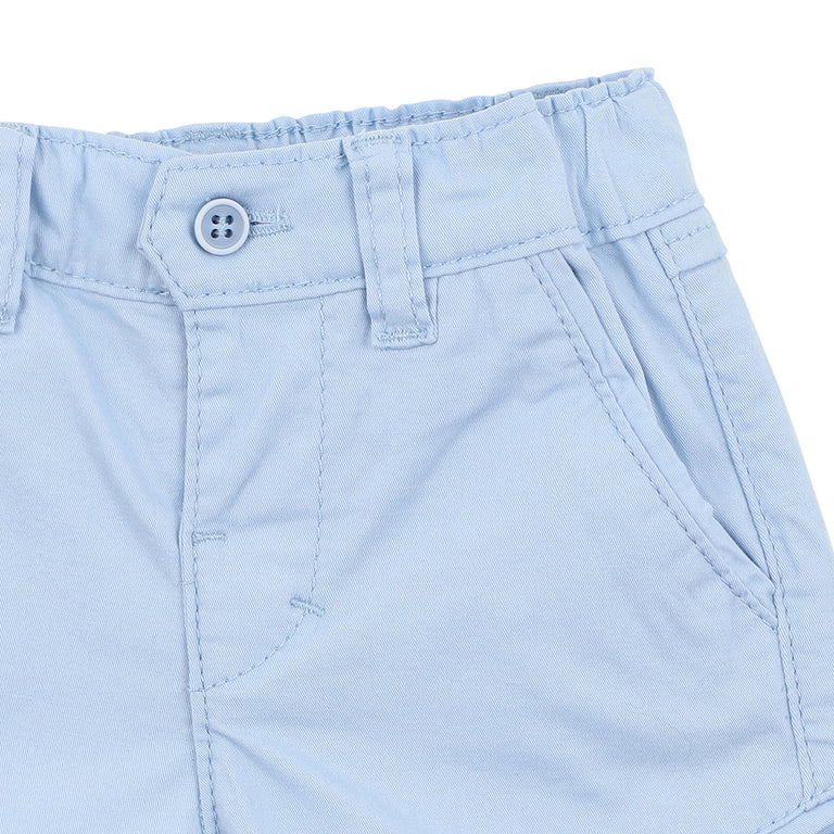 These light blue stretch cotton shorts feature front side pockets, a back and lower side welt pocket, a fly front and an adjustable elasticised waist for comfort, perfect to pair back with a shirt. Australian owned and designed. Made in China.