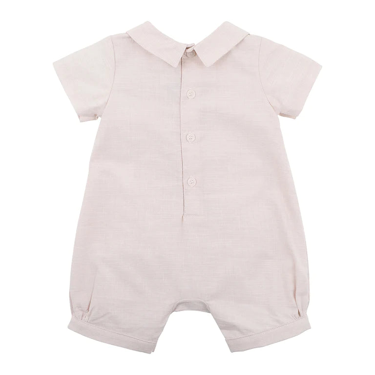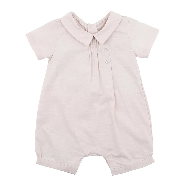 This short sleeve cotton blend romper features a collar with pintucks at the neck and side neck buttons, gathered leg with cuff, back neck button opening and a concealed press stud crotch opening for ease of dressing. Australian owned and designed. Made in China.