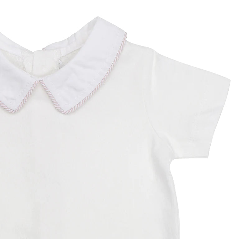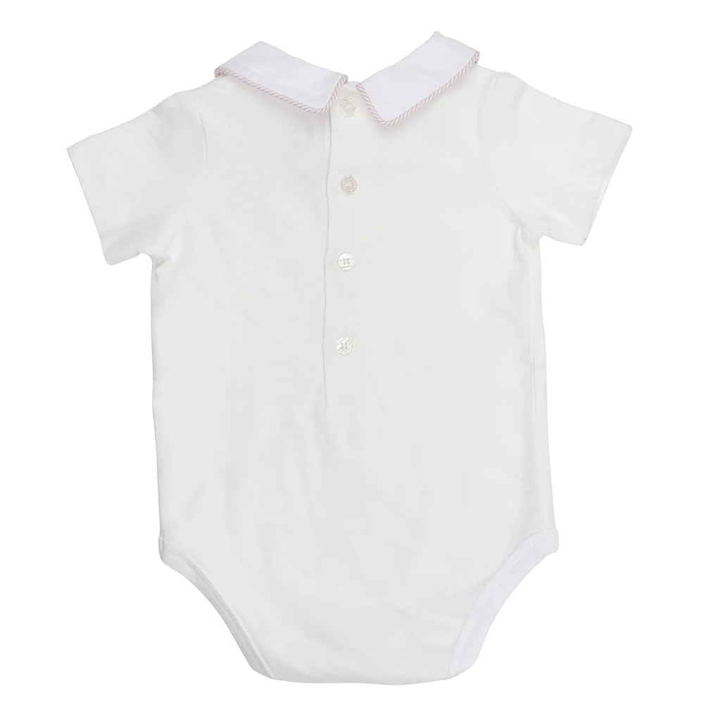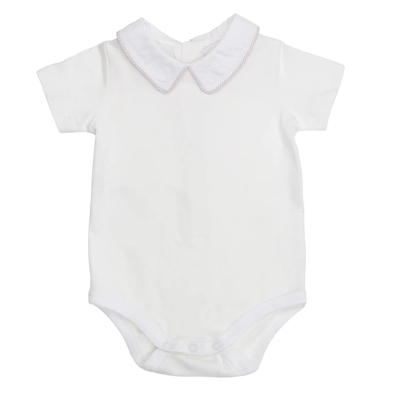 Perfect for special occasions, this short sleeve bodysuit features a collar with a contrast piped edge, back neck button opening and a press stud crotch opening for ease of dressing. Garment photographed in size 00 (3-6mth). Australian owned and designed. Made in China.