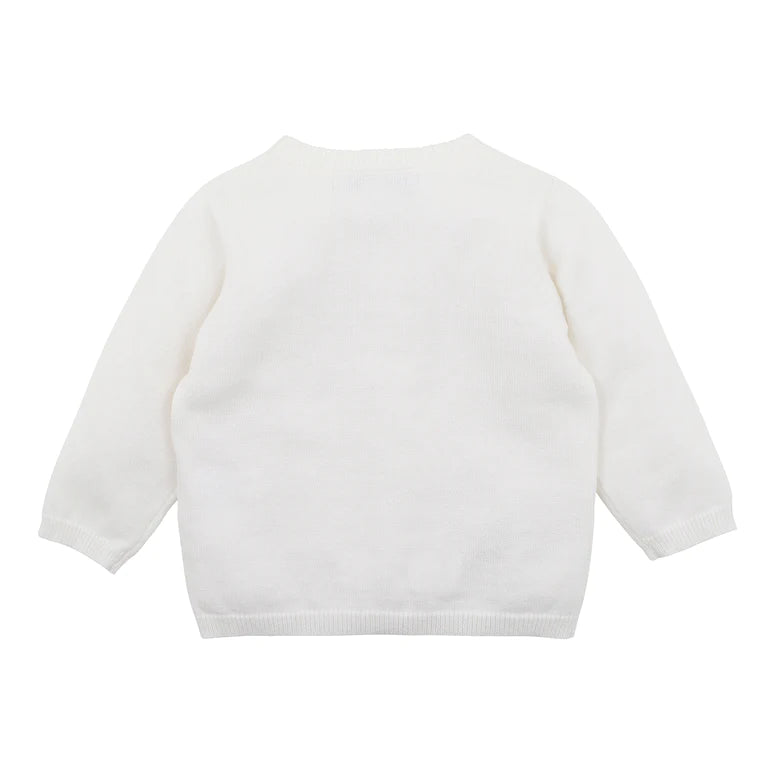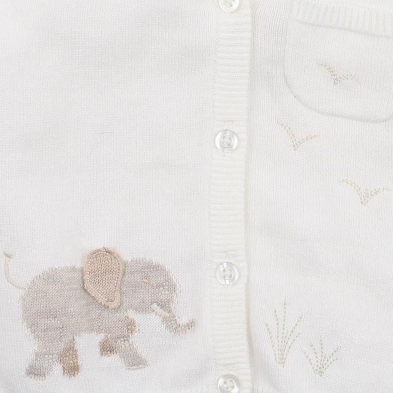 This cosy knitted cotton cardigan with v neck, chest pocket and front buttons for easy dressing, features a sweet elephant graphic on the front hem with embroidered birds. Garment photographed in size 00 (3-6mth). Australian owned and designed. Made in China.