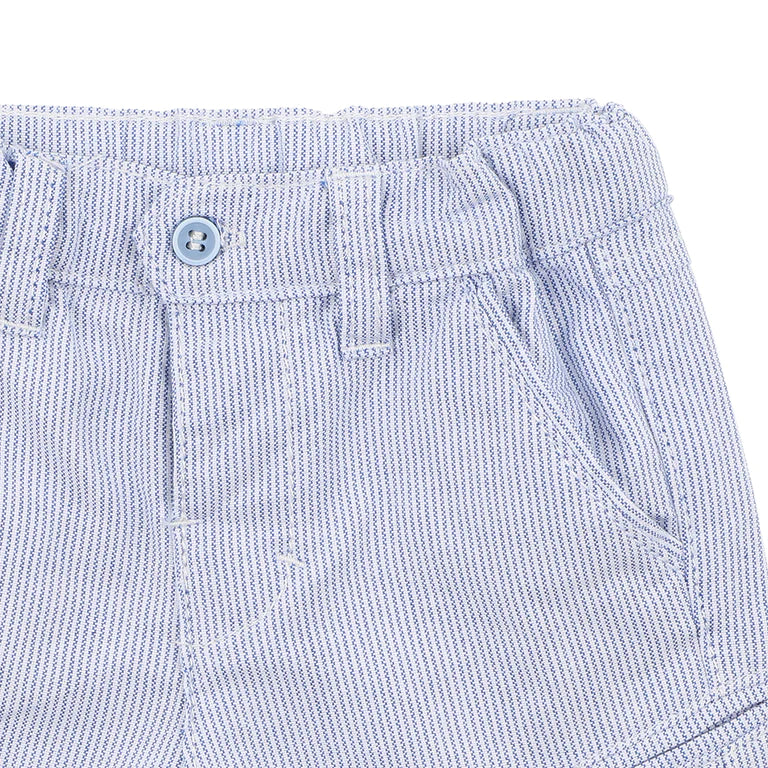 These blue stripe cotton shorts feature a fly front, front side pockets, a back and lower side welt pocket and an adjustable elasticised waist for comfort, perfect to pair back with a shirt. Australian owned and designed. Made in China