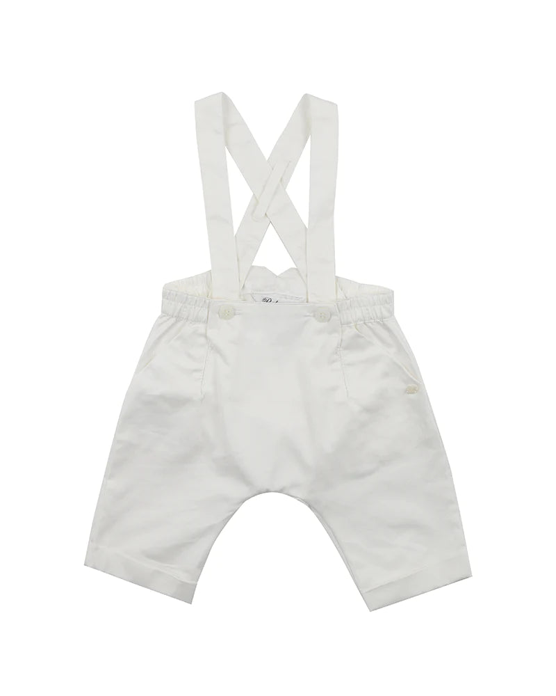 These ivory cotton sateen overalls with front button opening is the perfect piece for your little one's special day, pair it back with the Crown bodysuit to complete the outfit.