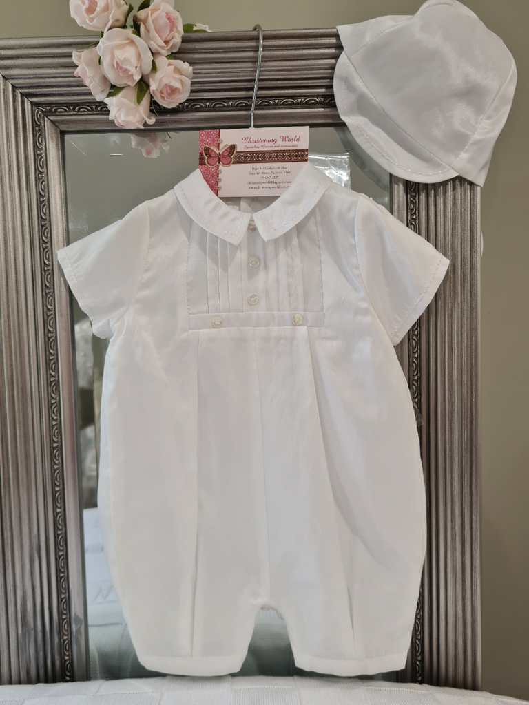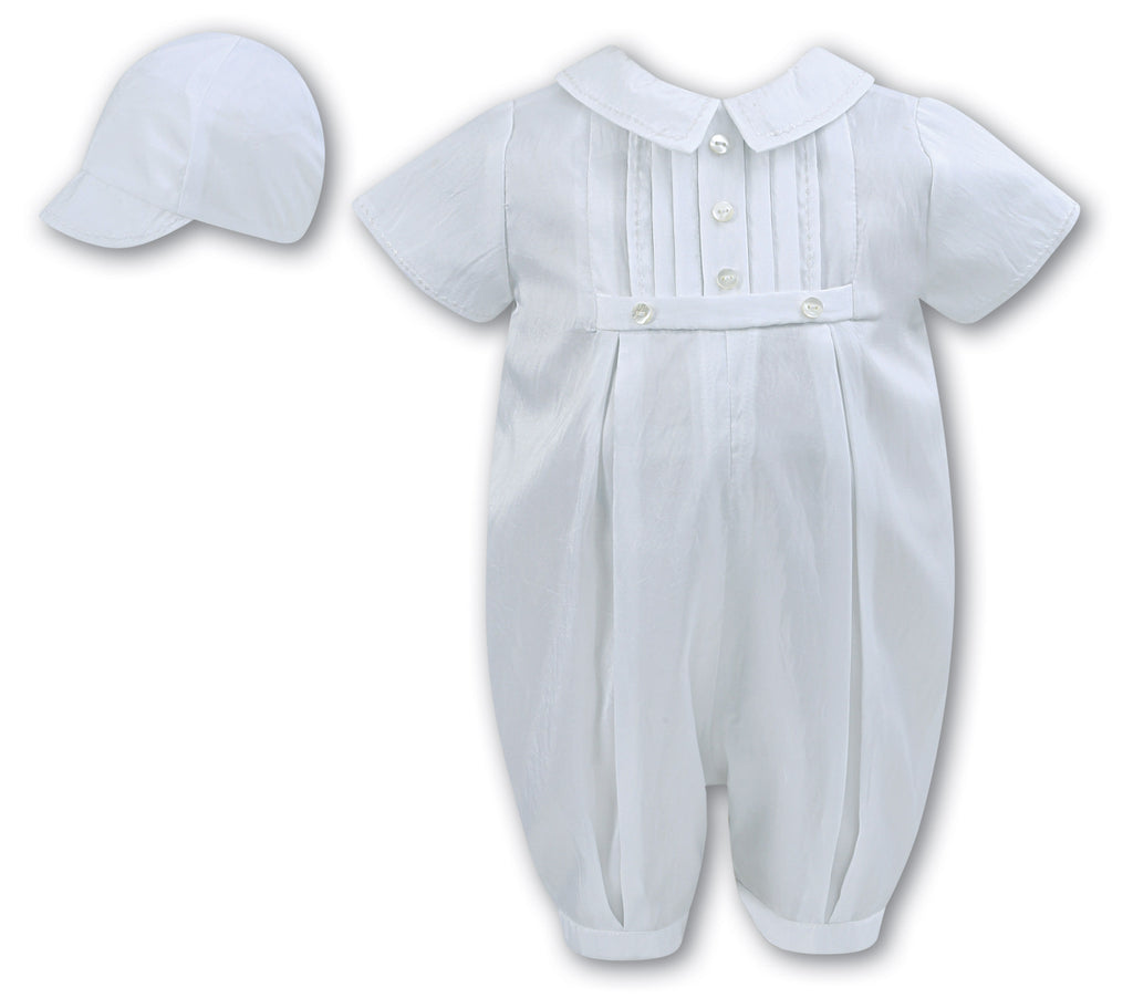 Boys Romper and Cap, a classic design with pearl buttons and intricate hand-pleated details.